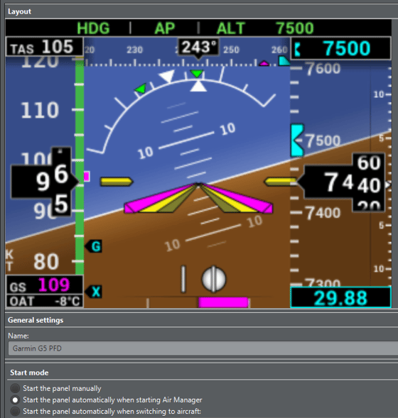 Once this is completed you will see "Garmin G5" added to the panel selector stack on the left side of the Air Manager interface: