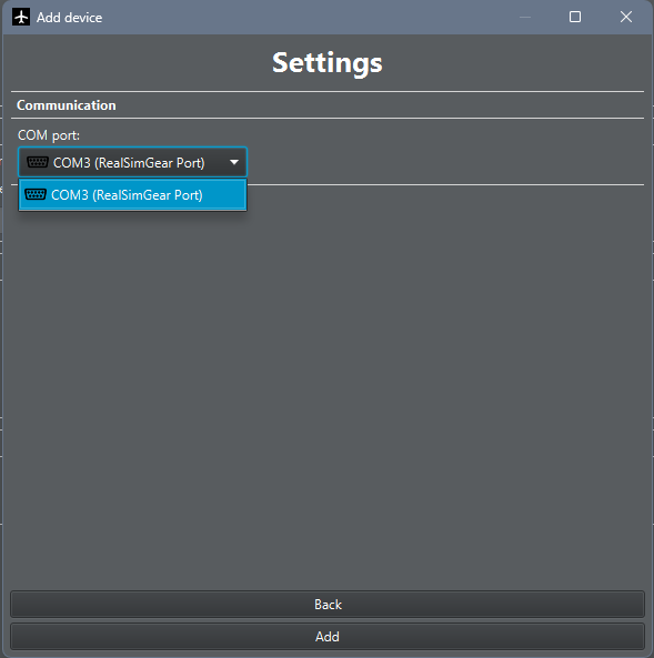 At this time the only RealSimGear Device you should have connected to your PC is the first G5. Please select the COM port assigned to this device: