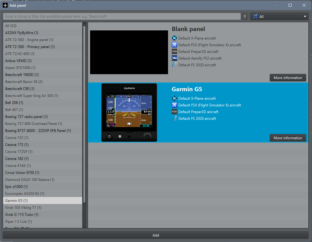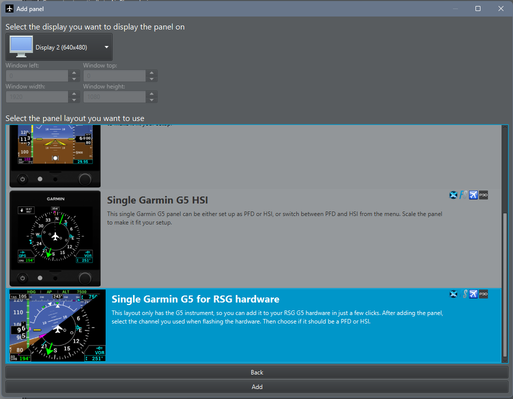 Next, select the panel layout you want to use. In this case you must select "Single Garmin G5 for RSG Hardware", then click Add.